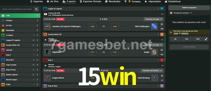 O 15win oferece uma grande seleção de opções de apostas em e-sports com probabilidades competitivas
